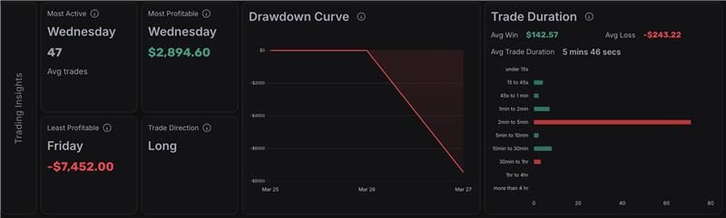 The Drawdown Curve The steep drop between Mar 25-27, reaching -$8,000, was a concentrated loss event, not gradual erosion. Journal that window specifically: setup, market context, position sizing. That's where the answer is.