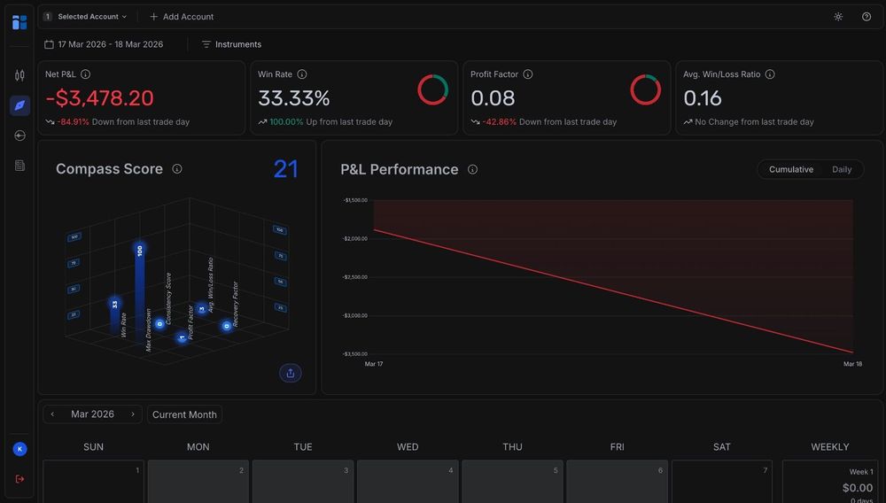 Fig 2: Compass Dashboard: Net P&L, Win Rate, Profit Factor & Compass Score (Mar 17-18, 2026)