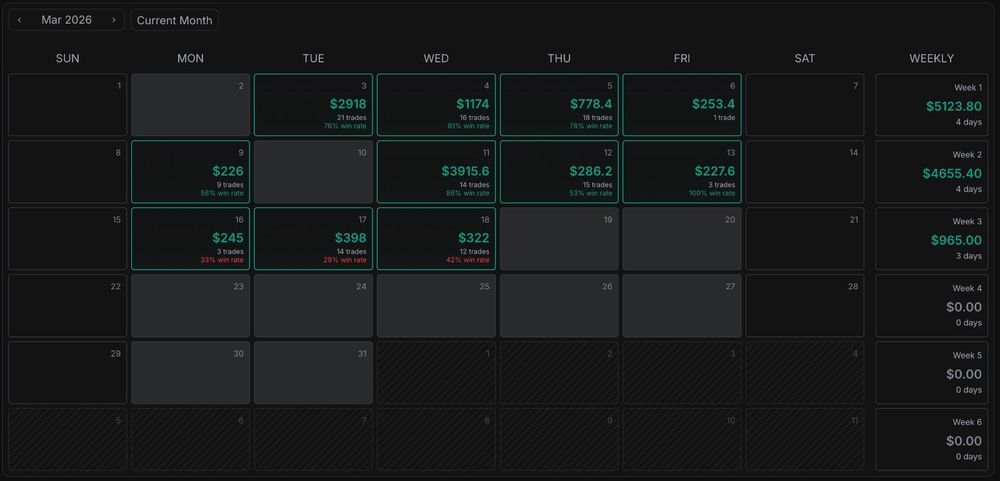 The Compass calendar makes this concrete. Week 1: $5,123 profit, win rates 76-81%. Week 2: another $4,655. Week 3: $965, win rates down to 29-42%. Without a journal, a trader blames the market. With one, they find the pattern: overtrading, widened stops, chasing setups that weren't there.