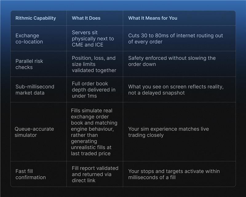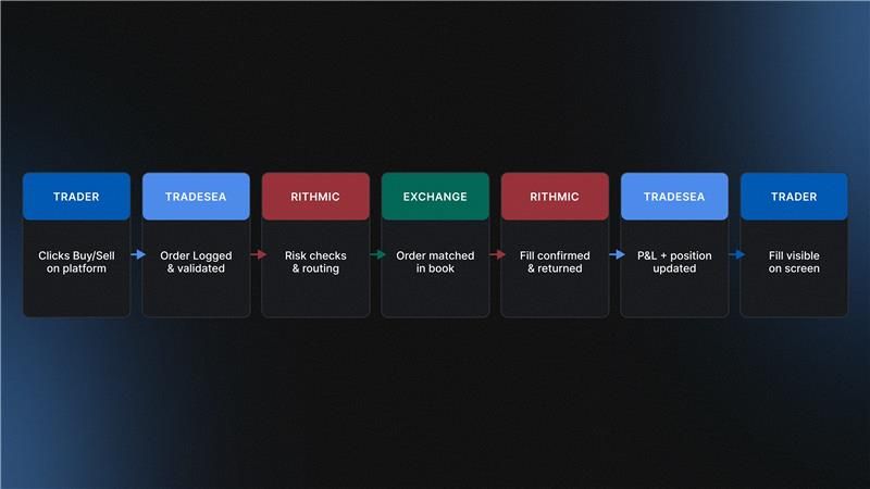 Rithmic is not a trading platform you see or interact with directly. It is the professional-grade infrastructure that sits between Tradesea and the exchange, doing the heavy lifting that makes fast, reliable execution possible. Think of it as the high-speed express lane that your order travels through rather than the regular road.