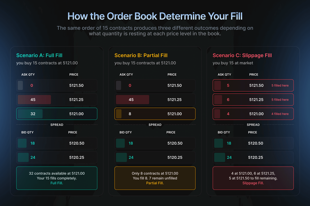 Most simulators make a simplifying assumption: if the market traded at your price, you got filled. That sounds reasonable but it is wrong. In a real exchange, your order joins a queue. If 500 contracts are already resting at 5121.00 ahead of you and only 200 trade at that level, you get nothing. The 200 went to the orders that arrived before yours.