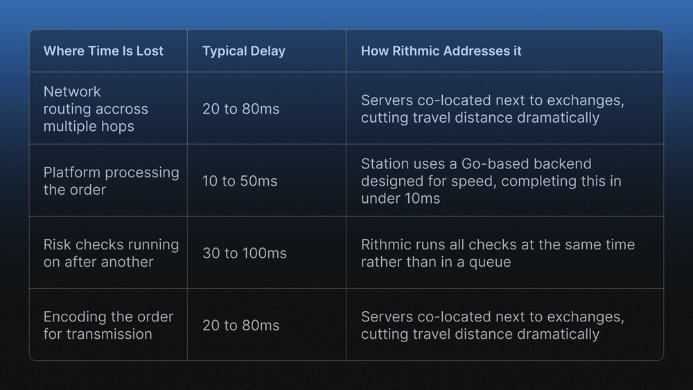 Think of it like a relay race. Each runner adds only a few seconds, but by the time the baton reaches the finish line, the total time is what determines whether you win or lose. A 20ms delay here, a 30ms delay there, and suddenly your order is arriving at the exchange 100 to 150ms after you clicked. In a fast-moving market, prices can shift significantly in that window.